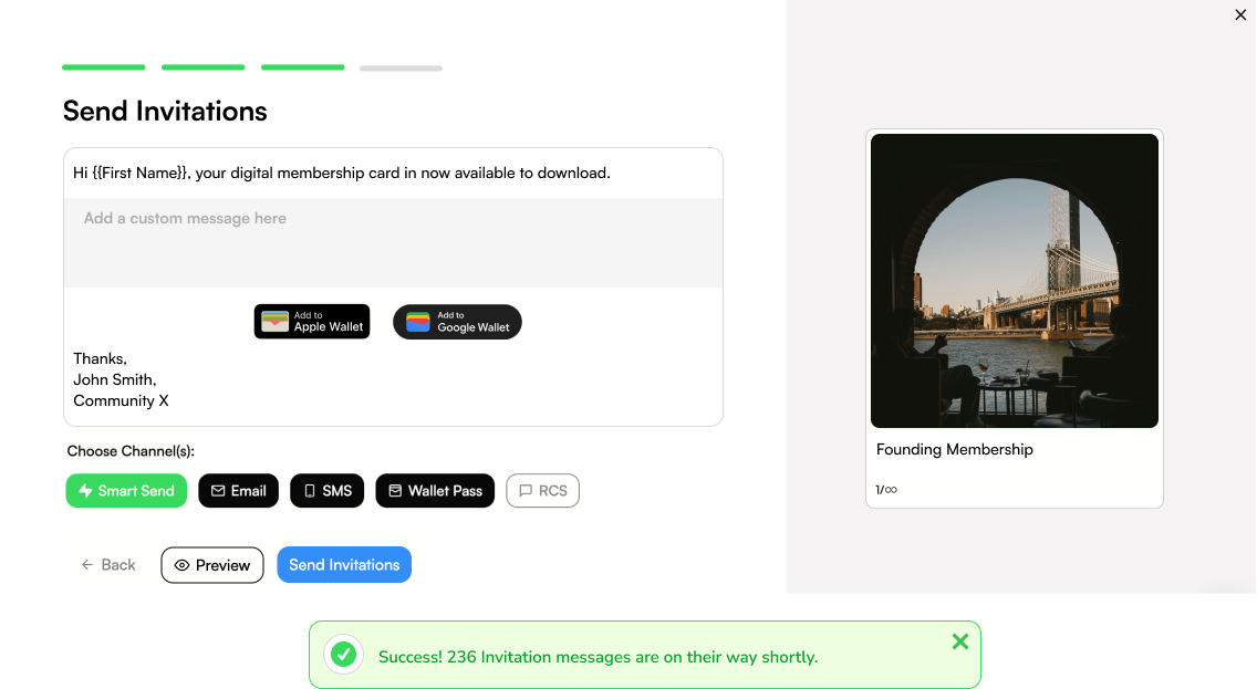 Allow community managers to generate digital membership cards (with a member import feature) and distribute them via our supported communication channels (including SMS).